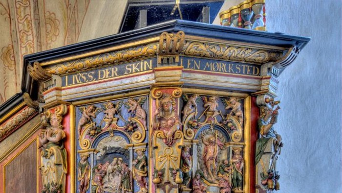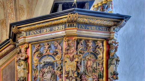 Ved siden af prædikestolen i Allerslev Kirke hænger fire timeglas, der blev sat op omkring år 1700.